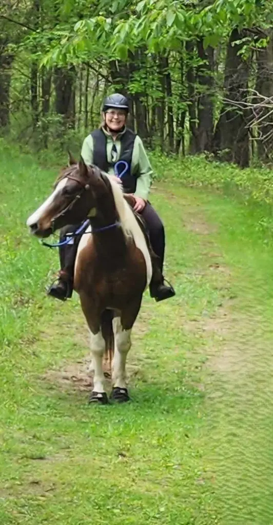 I’ve been riding since I was 10 and spent years showing hunters throughout Michigan before retiring my beloved show horse. These days, I enjoy camping and trail riding with my horse Timmy. I live in Whitmore Lake with my husband Darrin, our dog Pepper, 2 goats Darla and Clare, a mini named Mylo, my horse Timmy and 17 chickens. I work as a licensed professional counselor and school counselor.